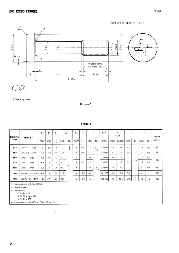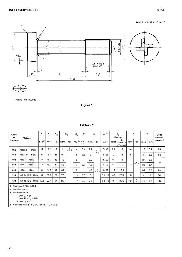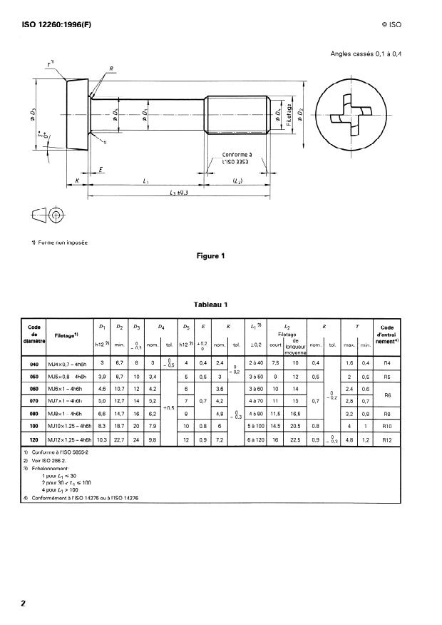 ISO 12260:1996 - Aéronautique et espace -- Vis a tete cylindrique, a empreinte cruciforme déportée, avec ou sans saillies antidérapantes, a fut dégagé et filetage MJ court ou de longueur moyenne, en matériau métallique, revetues ou non revetues, des classes de résistance inférieures ou égales a 1 100 MPa -- Dimensions