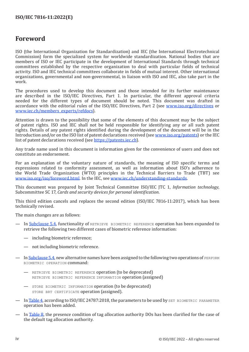 Keywords: ISO/IEC 7816-11:2022, integrated circuit cards, biometric verification, on-card biometric comparison, PERFORM BIOMETRIC OPERATION, biometric reference, enrolment, VIDO, VIT, BER-TLV.