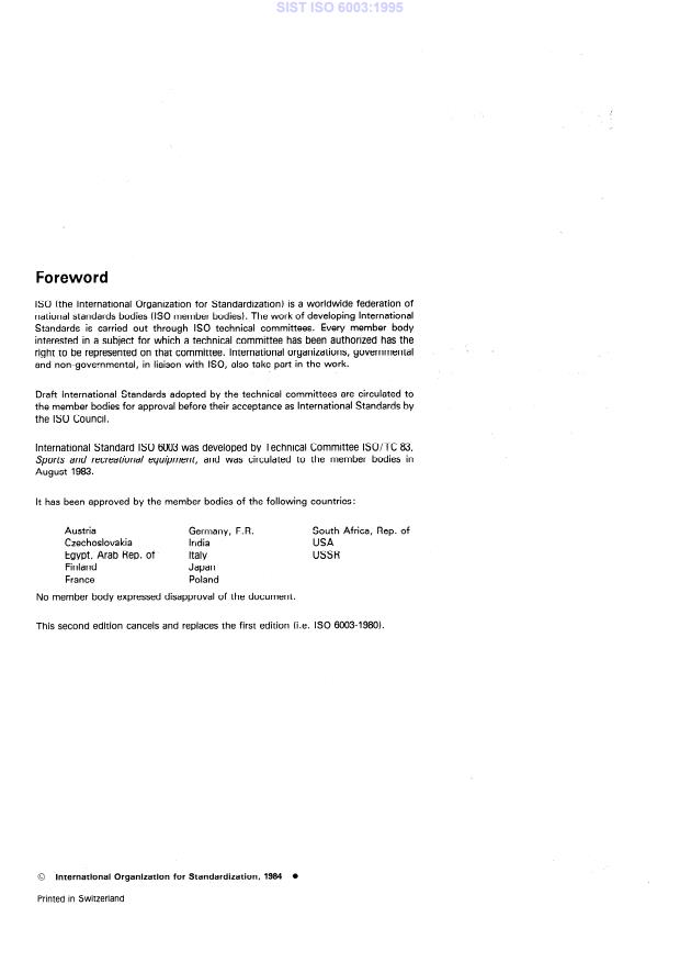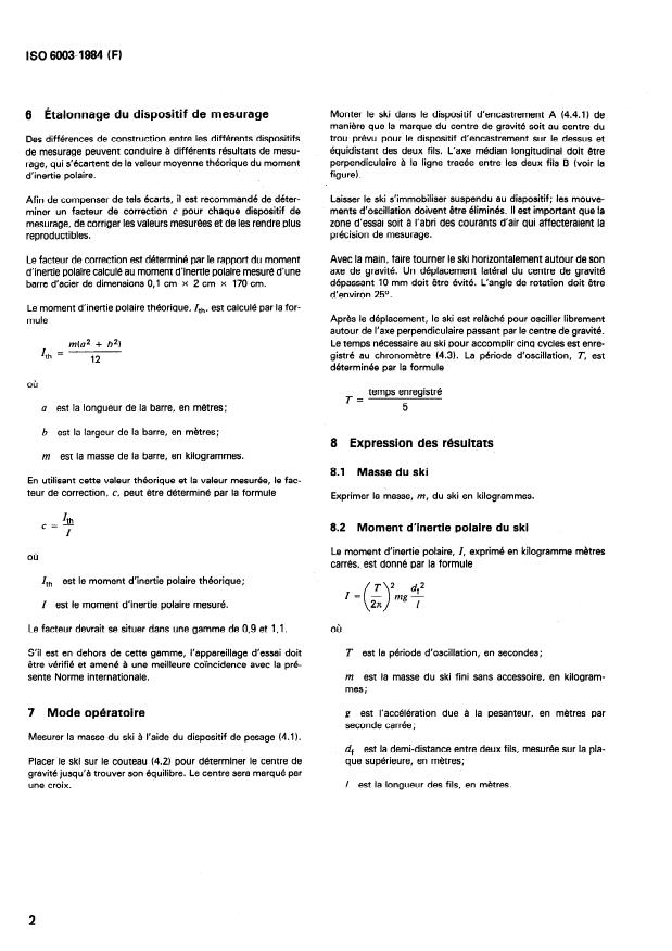 ISO 6003:1984 is a standard published by the International Organization for Standardization (ISO). Its full title is "Alpine skis — Determination of mass and polar moment of inertia — Laboratory measurement method". This standard covers: Specifies laboratory measuring methods for the characteristics mentioned above. If laboratory measurement data are determined by the manufacturer, standard measurement procedures are recommended to ensure compatibility. Specifies also a tolerance range which shall be met by the measurement data of all manufactured skis, if for the specific model length measurement data are published by the manufacturer. It is not the purpose of these methods to evaluate these data with regard to their influence on the quality of the ski.