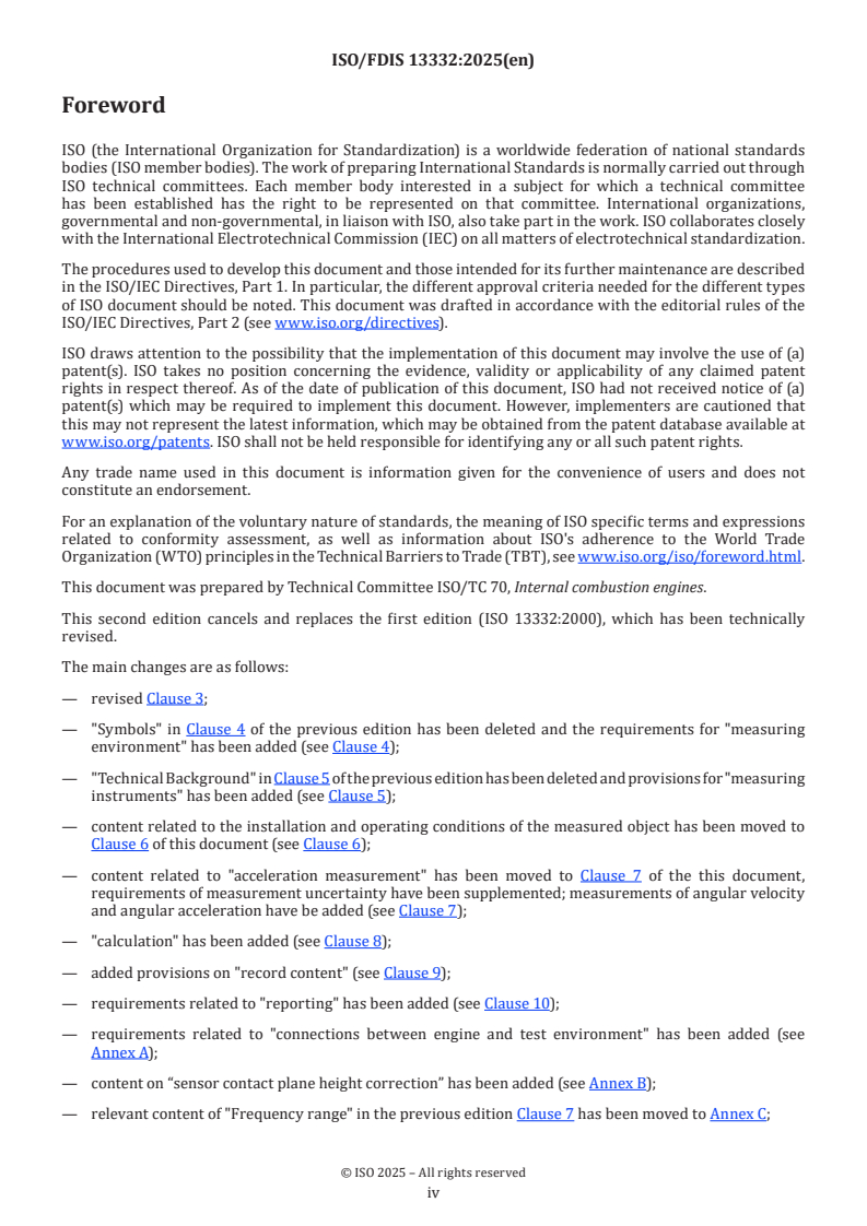 REDLINE ISO/FDIS 13332 - Reciprocating internal combustion engines — Test code for the measurement of structure-borne noise emitted from high-speed and medium-speed reciprocating internal combustion engines measured at the engine feet Released:3. 09. 2025