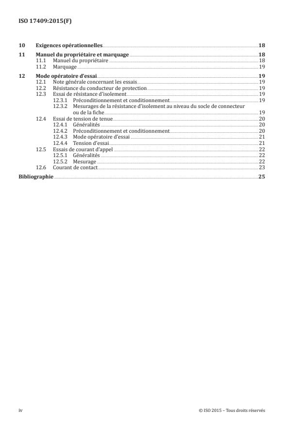 ISO 17409:2015 specifies electric safety requirements for conductive connections of electrically propelled road vehicles to an external electric power supply using a plug or vehicle inlet. It applies to electrically propelled road vehicles with voltage class B electric circuits. In general, it may apply to motorcycles and mopeds if no dedicated standards for these vehicles exist. It applies only to vehicle power supply circuits. It applies also to dedicated power supply control functions used for the connection of the vehicle to an external electric power supply. It does not provide requirements regarding the connection to a non-isolated d.c. charging station. It does not provide comprehensive safety information for manufacturing, maintenance, and repair personnel. The requirements when the vehicle is not connected to the external electric power supply are specified in ISO 6469‑3. NOTE 1 This International Standard does not contain requirements for vehicle power supply circuits using protection by class II or double/reinforced insulation but it is not the intention to exclude such vehicle applications. NOTE 2 Requirements for EV supply equipment are specified in IEC 61851.