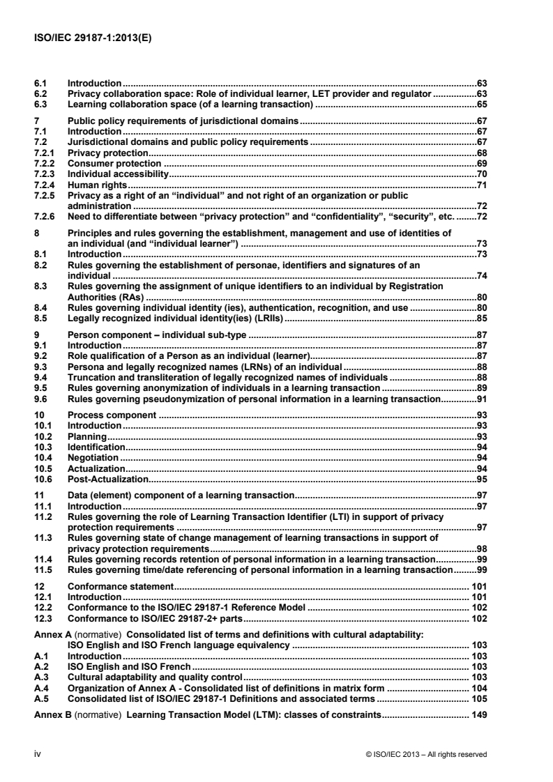 ISO/IEC 29187-1:2013 has been developed to support modelling generic international requirements for identifying and providing privacy protection of personal information throughout any kind of ICT-based learning transaction where the individual has the role of an individual learner. It provides users and designers with a methodology and tools addressing privacy protection and related requirements imposed by applicable jurisdictional domains. ISO/IEC 29187-1:2013 takes the "learning operational view" (LOV) aspects based on the ISO/IEC 14662 Open-edi Reference Model (a freely available ISO standard) together with applicable ISO standards including ISO/IEC 15944-1 and ISO/IEC 15944‑5 (also available without charge) as well as many other international referenced specifications. ISO/IEC 29187-1:2013 models the requirements of jurisdictional domains as external constraints upon the creation, use, interchange, and information life cycle management of personal information. ISO/IEC 29187-1:2013 addresses the specified context of public policy requirements of jurisdictional domains controlling the use of personal information (PI). These include regulations for consumer protection, privacy protection, individual accessibility, etc. ISO/IEC 29187-1:2013 in a LET context identifies and expands upon eleven generic, primitive, international principles that have been associated with privacy protection requirements by international, regional, and UN member states. It models them with respect to the "collaboration space" of a learning transaction and commitment exchange involving an individual acting in the role of an individual learner. In a LET context, it provides principles and rules governing the establishment, management and use of identifiers of that individual, including the use of legally recognized names (LRNs), recognized individual identity (rii), and methods of non-identification, such as the use of anonymization and pseudonymization of personal information. ISO/IEC 29187-1:2013 also sets out principles governing information lifecycle management (ILCM) as well as the rules and associated coded domains for obtaining informed consent for collection, specifying state changes, records retention, record deletion and related matters in support of privacy protection requirements.