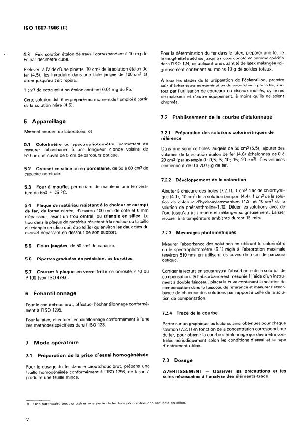 ISO 1657:1986 - Caoutchouc brut et latex de caoutchcouc -- Dosage du fer -- Méthode photométrique a la phénanthroline-1,10