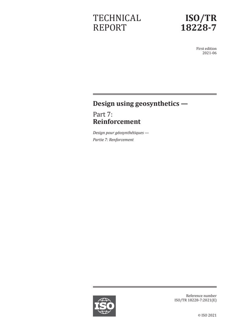 ISO/TR 18228-7:2021 is a technical report published by the International Organization for Standardization (ISO). Its full title is "Design using geosynthetics — Part 7: Reinforcement". This standard covers: This document provides general considerations to support the design guidance to geotechnical and civil engineers involved in the design of structures in which a geotextile is used as reinforcement. The key potential failure mechanisms are described, and guidance is proposed to select engineering properties.