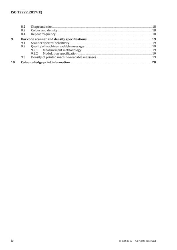 1.1 ISO 12222:2017 specifies the position and dimensions of machine-readable identification numbers on 16 mm, 35 mm and 65 mm motion-picture film. These numbers are intended to be a machine-readable version of the latent image key number. ISO 12222:2017 also specifies the encoding format to be used for these machine-readable numbers, as well as the area scanned and the spectral characteristics of the scanner. 1.2 ISO 12222:2017 also specifies the position, dimensions and content of human-readable identification (key) numbers for use on 16 mm, 35 mm and 65 mm motion-picture films intended for original photography or intermediate printing which also include the machine-readable key number described in 1.1. NOTE These numbers normally are exposed onto the film at the time of manufacture. 1.3 ISO 12222:2017 further specifies an area that may be used for optional manufacturer-specific film-type identification information. 1.4 ISO 12222:2017 also specifies an area on the film which is not to be exposed by the film manufacturer, thus leaving it available for customer data recording. 1.5 Finally, ISO 12222:2017 specifies an optional frame line index mark for 35 mm and 65 mm film.