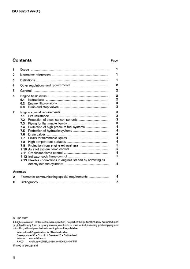 ISO 6826:1997 is a standard published by the International Organization for Standardization (ISO). Its full title is "Reciprocating internal combustion engines — Fire protection". This standard covers: Gives requirements for reciprocating internal combustion engines to minimize the risk of fire caused by the engine and the auxiliaries related to it. Applies to all reciprocating internal combustion engines for land vehicles, rail-traction and marine use, excluding engines used to propel agricultural tractors, road vehicles, road construction and earth-moving machines and aircraft.