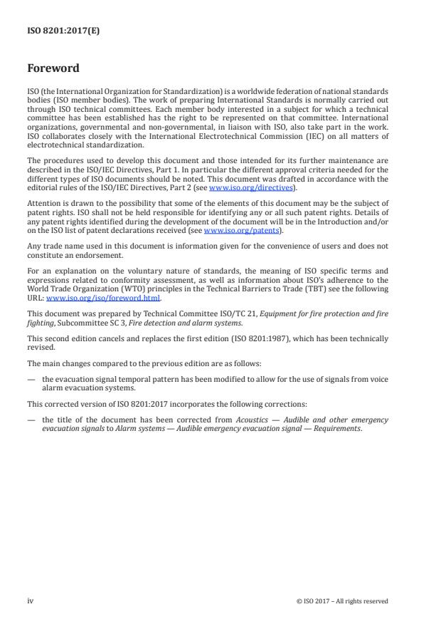 ISO 8201:2017 is a standard published by the International Organization for Standardization (ISO). Its full title is "Alarm systems - Audible emergency evacuation signal - Requirements". This standard covers: ISO 8201:2017 specifies the requirements for an audible emergency evacuation signal intended to indicate without ambiguity, to all persons within the reception area of the signal, that an emergency situation (fire, gas leaks, explosion, nuclear radiation, etc.) requires immediate evacuation. Two acoustic parameters of the audible emergency evacuation signal are defined: the temporal pattern and the required sound pressure level at all places within the intended reception area of the signal. NOTE Recognition of the signal does not require the specification of its spectral content, which can be selected to satisfy specific site requirements. The signal specified in this document is intended to be used in buildings, including but not limited to schools, hotels, residential buildings, public institutions and work places (such as factories and offices) The signal can also be used in outside areas. ISO 8201:2017 is not applicable to warning signals, to signals for public disaster control or to alarm systems on board ships or in outdoor moving vehicles, such as police cars, fire engines and ambulances. The individual signalling-system components of the signal are also out of the scope of this document.