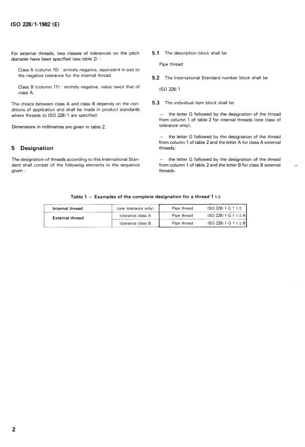 ISO 228-1:1982 is a standard published by the International Organization for Standardization (ISO). Its full title is "Pipe threads where pressure-tight joints are not made on the threads — Part 1: Designation, dimensions and tolerances". This standard covers: Pipe threads where pressure-tight joints are not made on the threads — Part 1: Designation, dimensions and tolerances