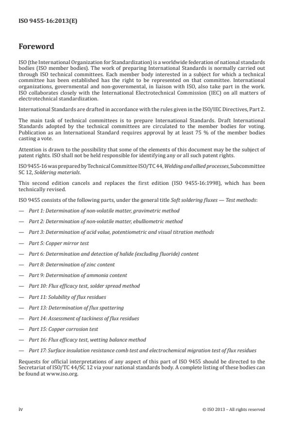 ISO 9455-16:2013 is a standard published by the International Organization for Standardization (ISO). Its full title is "Soft soldering fluxes — Test methods — Part 16: Flux efficacy test, wetting balance method". This standard covers: ISO 9455-16:2013 specifies a method for the assessment of the efficacy of a soft soldering flux, known as the wetting balance method. It gives a qualitative assessment of the comparative efficacy of two fluxes (for example, a standard and a test flux), based on their capacity to promote wetting of a metal surface by liquid solder. The method is applicable to all flux types in liquid form classified in ISO 9454‑1.