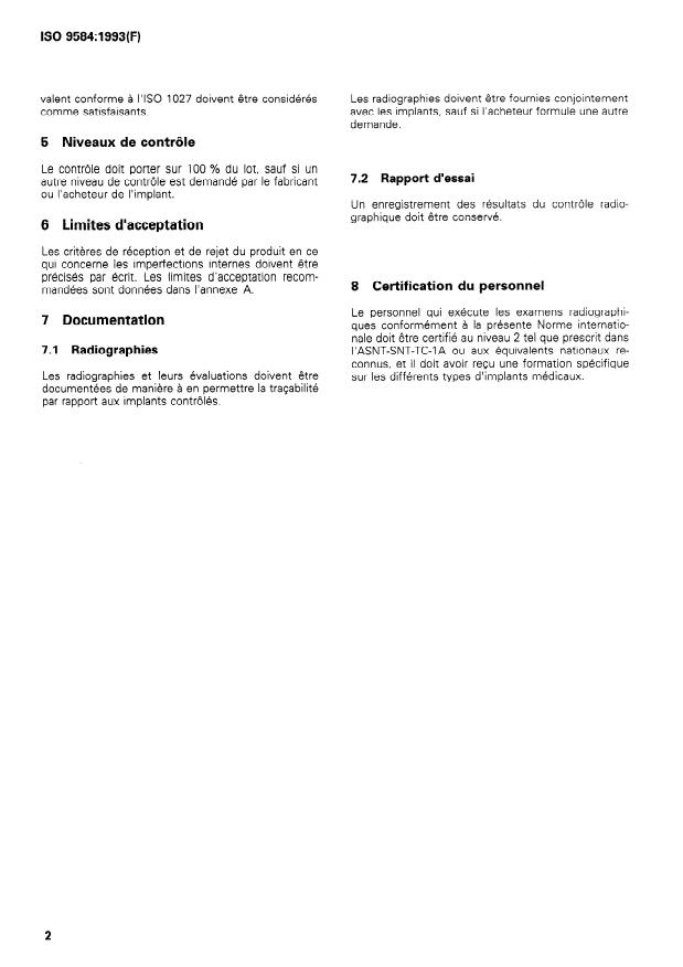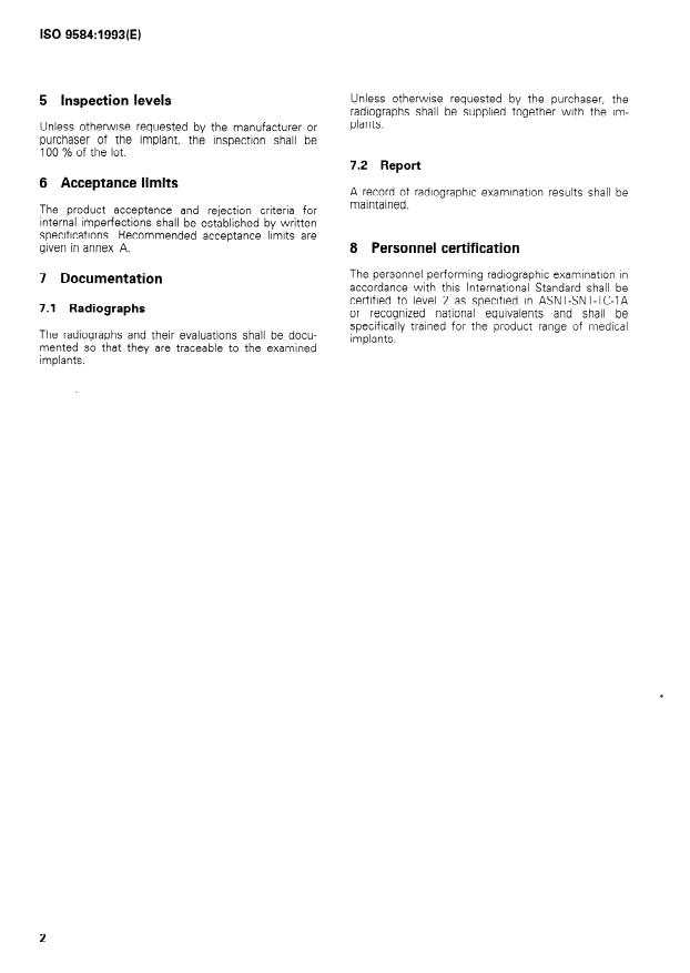 ISO 9584:1993 is a standard published by the International Organization for Standardization (ISO). Its full title is "Implants for surgery — Non-destructive testing — Radiographic examination of cast metallic surgical implants". This standard covers: The method for detecting and evaluating internal imperfections shall be performed in accordance with the requirements in ISO 1027 and ISO 5579. Guidance on the acceptance limits for internal imperfections is given in annex A.