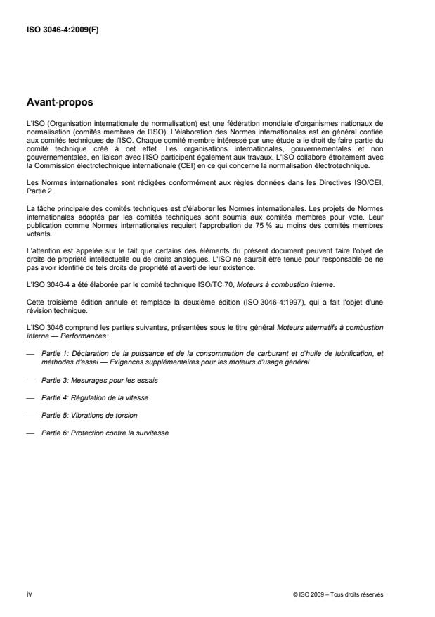 ISO 3046-4:2009 is a standard published by the International Organization for Standardization (ISO). Its full title is "Reciprocating internal combustion engines — Performance — Part 4: Speed governing". This standard covers: ISO 3046-4:2009 establishes a classification for the requirements and parameters of speed-governing systems and specifies terms and definitions of typical engine speeds for reciprocating internal combustion (RIC) engines. Where necessary, individual requirements are given for particular engine applications. ISO 3046-4:2009 applies to RIC engines for land, rail-traction and marine use, excluding engines used to propel road-construction and earth-moving machines, agricultural and industrial types of tractors, road vehicles and aircraft. Also excluded are self-governing engines and those engines requiring only maximum speed or maximum fuel delivery limitation. ISO 3046-4:2009 defines requirements for compression–ignition oil engines (diesel engines). For spark ignition engines and dual fuel engines, special requirements can apply.