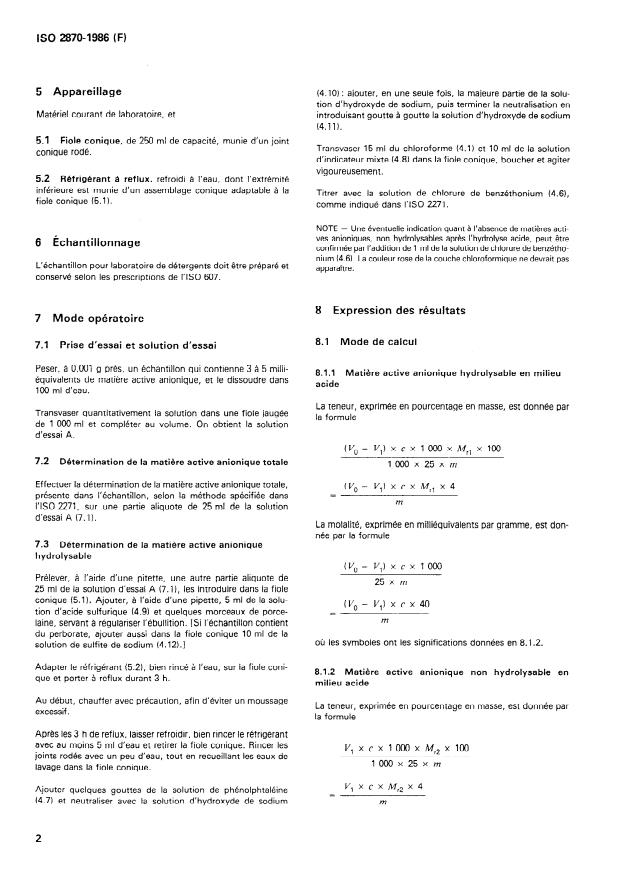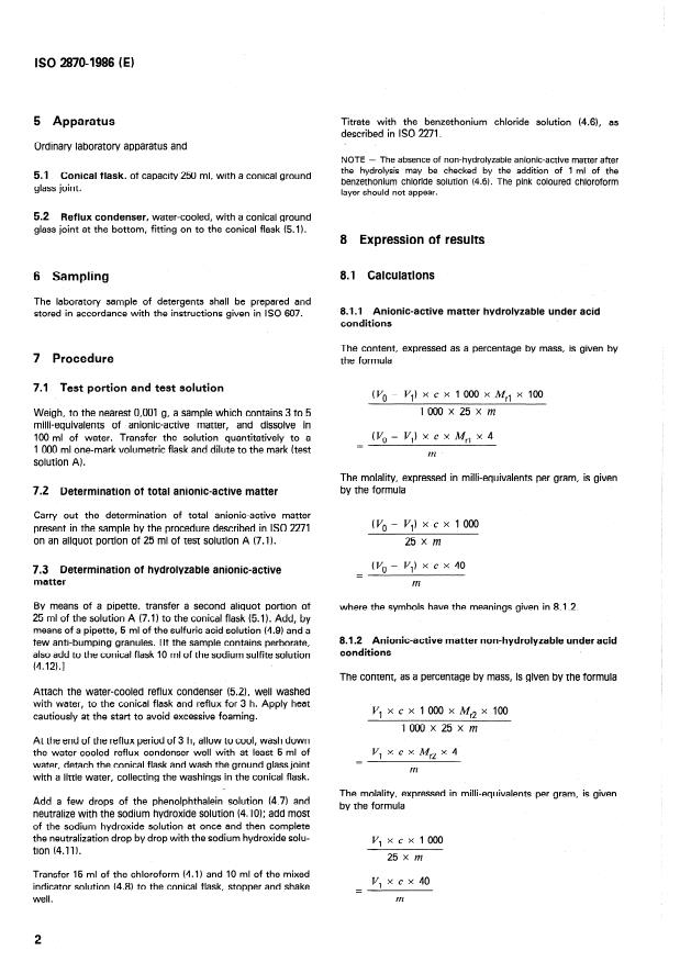 ISO 2870:1986 is a standard published by the International Organization for Standardization (ISO). Its full title is "Surface active agents — Detergents — Determination of anionic-active matter hydrolyzable and non-hydrolyzable under acid conditions". This standard covers: La présente Norme internationale spécifie une méthode de détermination, dans les détergents, de la matière active anionique hydrolysable et non hydrolysable en milieu acide. Ces matières actives comprennent les alkylsulfates et les alkylhydroxysulfates, les éthoxysulfates d'alkylphénol et d'alcool gras. La masse moléculaire relative moyenne des deux types de matière active doit être connue ou déterminée au préalable si leur teneur est exprimée en pourcentage en masse. Si le détergent contient du perborate, celui-ci doit être détruit avant l'hydrolyse.