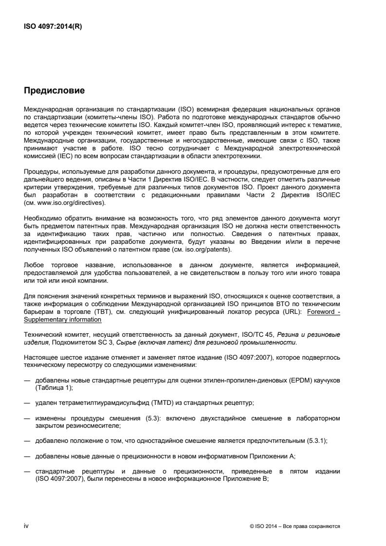 ISO 4097:2014 is a standard published by the International Organization for Standardization (ISO). Its full title is "Rubber, ethylene-propylene-diene (EPDM) — Evaluation procedure". This standard covers: ISO 4097:2014 specifies physical and chemical tests on raw rubbers; standard materials, standard test formulations, equipment, and processing methods for evaluating the vulcanization characteristics of ethylene-propylene-diene rubbers (EPDM), including oil-extended types.