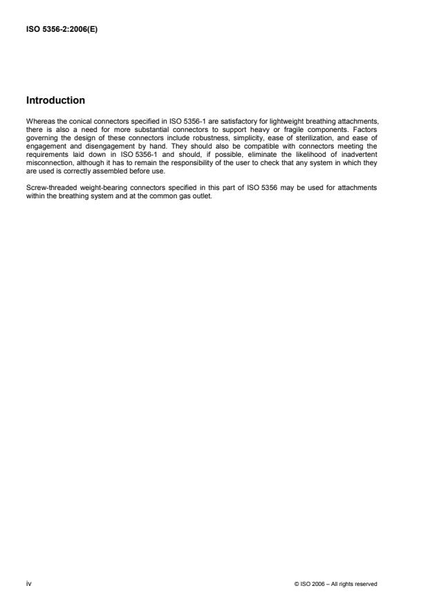 ISO 5356-2:2006 is a standard published by the International Organization for Standardization (ISO). Its full title is "Anaesthetic and respiratory equipment — Conical connectors — Part 2: Screw-threaded weight-bearing connectors". This standard covers: ISO 5356-2:2006 specifies requirements for screw-threaded weight-bearing conical connectors intended for use with inhalation anaesthesia apparatus and ventilators; such connectors are intended for mounting heavy accessories.