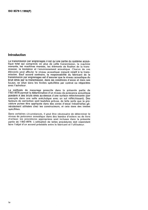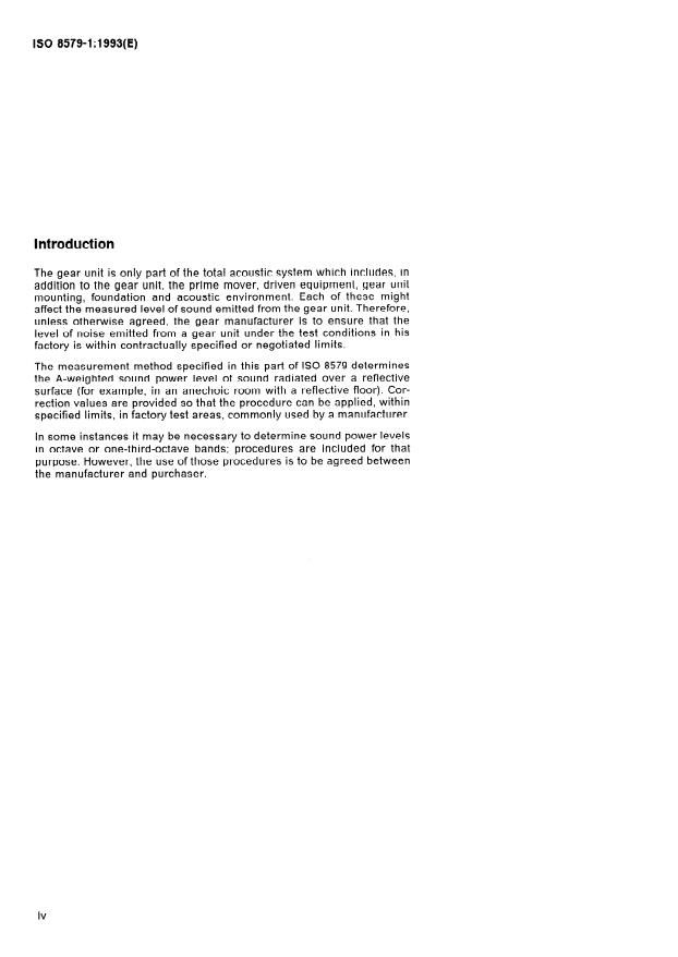 ISO 8579-1:1993 is a standard published by the International Organization for Standardization (ISO). Its full title is "Acceptance code for gears — Part 1: Determination of airborne sound power levels emitted by gear units". This standard covers: Specifies the conditions under which sound emitted from gear units is determined in order to establish a common procedure for comparison. The methods used are based on ISO 3744 and ISO 3746. Applies to all power transmission gearing other than gears for fine mechanisms. If it is necessary to determine sound power levels in octave or one-third-octave bands, the procedures should be agreed upon between manufacturer and purchaser.