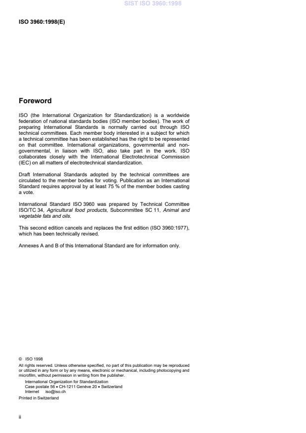 ISO 3960:1998 is a standard published by the International Organization for Standardization (ISO). Its full title is "Animal and vegetable fats and oils — Determination of peroxide value". This standard covers: Animal and vegetable fats and oils — Determination of peroxide value