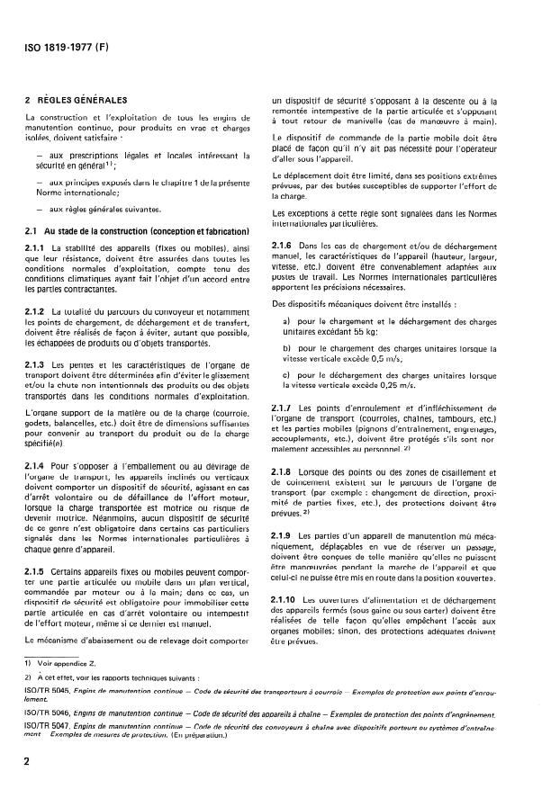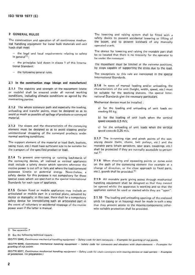 ISO 1819:1977 is a standard published by the International Organization for Standardization (ISO). Its full title is "Continuous mechanical handling equipment - Safety code - General rules". This standard covers: Sets out safety rules relating to continuous mechanical handling equipment, including its construction, installation, utilization and maintenance, to ensure that it is used to the best advantage, and to prevent any accidents or failures that could arise from misuse. These rules provide precise directives necessary to comply with legal texts and requirements decreed by governmental bodies in certain countries.