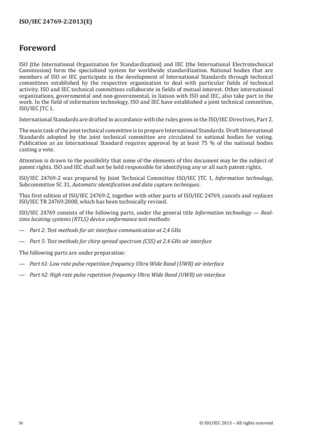 ISO/IEC 24769-2:2013 is a standard published by the International Organization for Standardization (ISO). Its full title is "Information technology — Real-time locating systems (RTLS) device conformance test methods — Part 2: Test methods for air interface communication at 2,4 GHz". This standard covers: ISO/IEC 24769-2:2013 defines the test methods for determining the conformance of 2,4 GHz real-time locating system (RTLS) tags with the specifications given in the corresponding subclauses of ISO/IEC 24730-2, but does not apply to the testing of conformity with regulatory or similar requirements. The test methods require only that the mandatory functions, and any optional functions which are implemented, be verified. This may in appropriate circumstances be supplemented by further, application-specific functionality criteria that are not available to the general case. The RTLS tag conformance parameters included in ISO/IEC 24769-2:2013 include the mandatory direct sequence spread spectrum (DSSS) 2,4 GHz radio frequency beacon. It also includes the optional on-off keyed, frequency shift keyed (OOK/FSK) short-range radio frequency link and the optional magnetic air interface. Unless otherwise specified, the tests in ISO/IEC 24769-2:2013 apply exclusively to RTLS tags defined in ISO/IEC 24730-2.