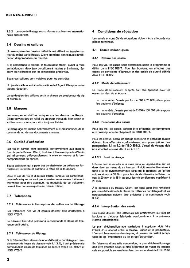 This part of ISO 6305 defines the specifications regarding product quality and the conditions of acceptance for nuts and bolts. Gives manufacturing and acceptance conditions, data to be supplied by the purchaser and packaging. Annexes A to D contain progressive sampling plans.