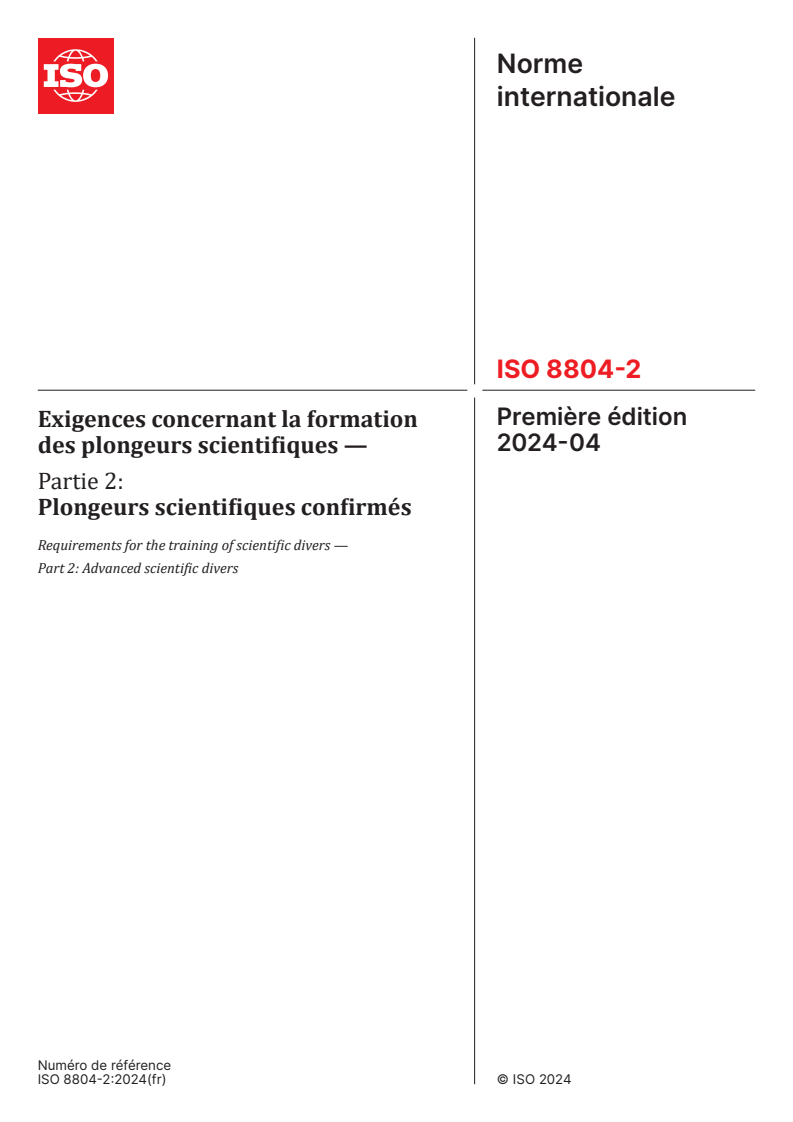 ISO 8804-2:2024 - Exigences concernant la formation des plongeurs scientifiques — Partie 2: Plongeurs scientifiques confirmés Released:5/21/2024