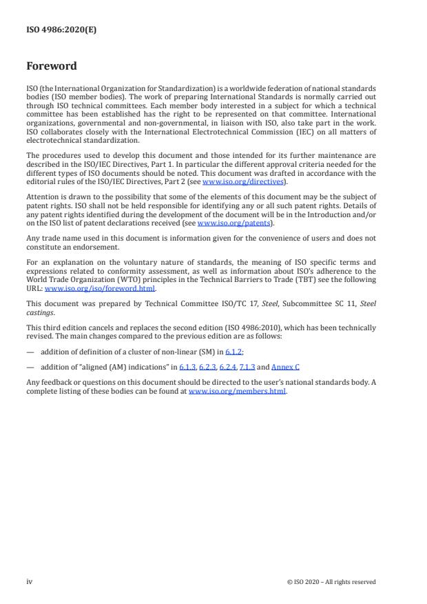 ISO 4986:2020 is a standard published by the International Organization for Standardization (ISO). Its full title is "Steel and iron castings — Magnetic particle testing". This standard covers: This document specifies a method for the magnetic particle testing of ferro-magnetic steel and iron castings. It also gives acceptance criteria through severity levels defined by the nature, the area and the dimensions of the discontinuities present. This document is applicable to all ferro-magnetic castings, independent of the moulding method. A steel and iron casting is considered to be ferro-magnetic if the magnetic induction is greater than 1 T (Tesla) for a magnetic field strength of 2,4 kA/m. This document only applies to those areas of the castings specified for testing, as well as the percentage of castings to be tested.