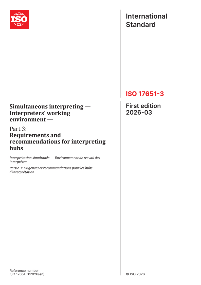 ISO 17651-3:2026 is a standard published by the International Organization for Standardization (ISO). Its full title is "Simultaneous interpreting — Interpreters’ working environment — Part 3: Requirements and recommendations for interpreting hubs". This standard covers: This document specifies requirements and provides recommendations for the design, equipment and operation of interpreting hubs for simultaneous interpreting. This document also ensures the usability and accessibility of interpreting hubs for all interpreters. This document builds upon ISO 20109 and ISO 24019, which both contain requirements and recommendations regarding the equipment necessary for simultaneous interpreting.