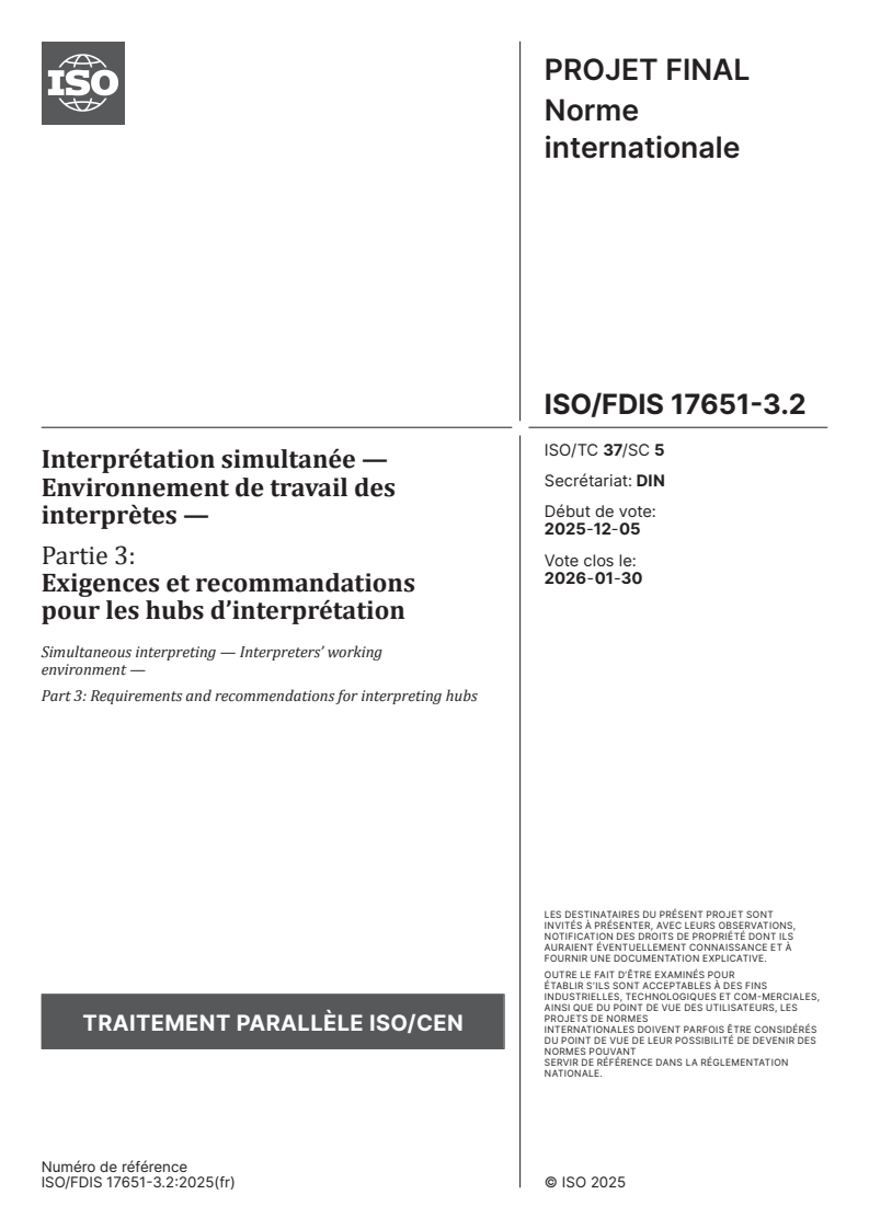 ISO/FDIS 17651-3.2 - Interprétation simultanée — Environnement de travail des interprètes — Partie 3: Exigences et recommandations pour les hubs d’interprétation Released:17. 12. 2025