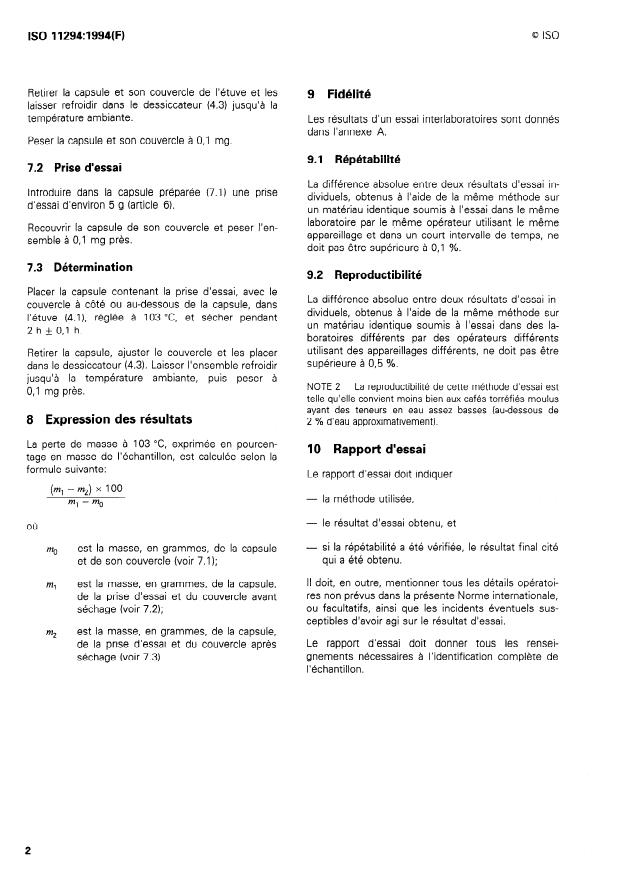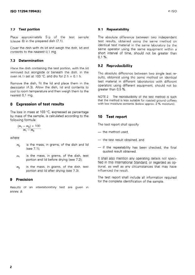 ISO 11294:1994 specifies a routine gravimetric method for determining the moisture content of roasted ground coffee by measuring the loss in mass at 103 °C. The method is intended primarily for degassed roasted ground coffee because roasted coffee contains volatile matter (notably carbon dioxide) that can affect moisture determinations. Results obtained with ISO 11294 compare closely with moisture values from the Karl Fischer method (ISO 11817).