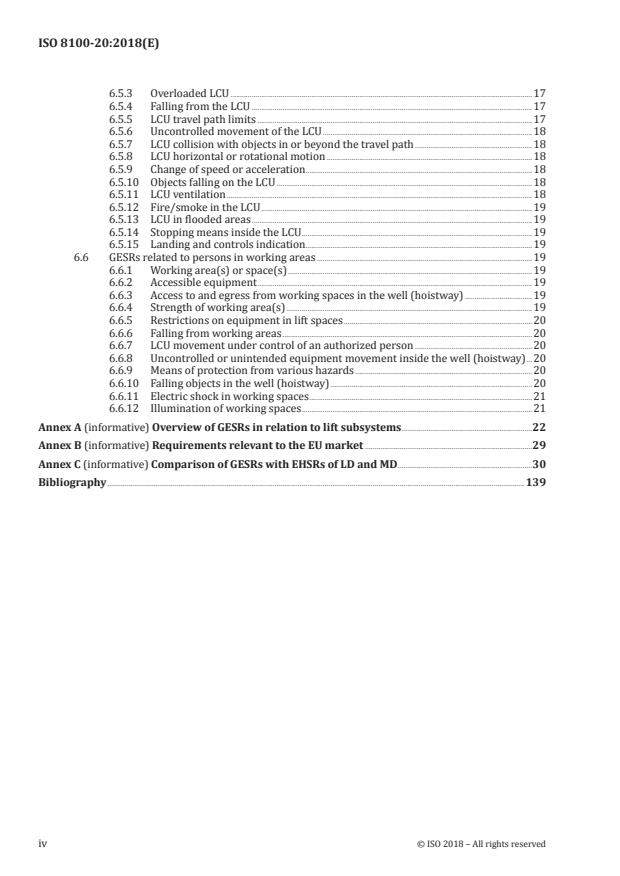 - Implementation guidance: Annex A maps GESRs to lift subsystems; Annex B offers information relevant to the EU market; Annex C compares GESRs with EU EHSRs.