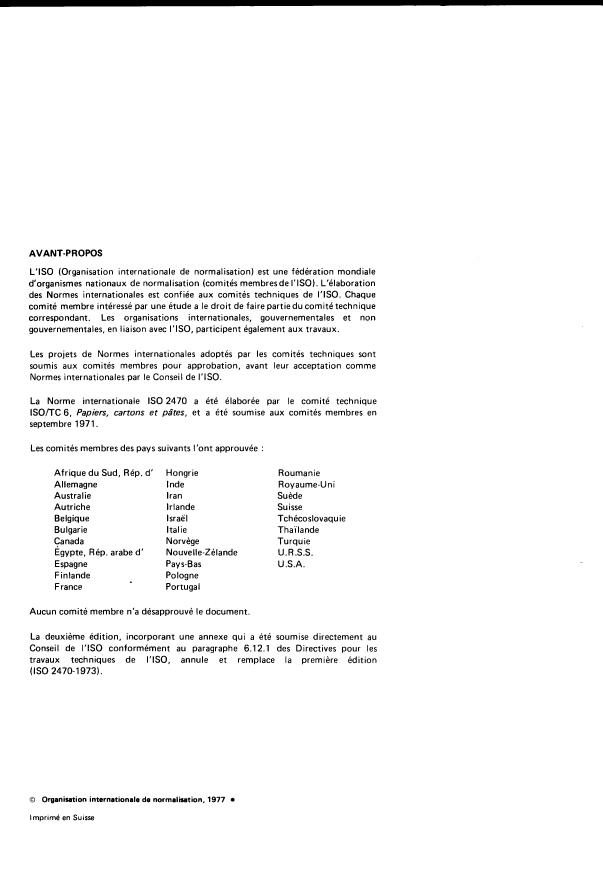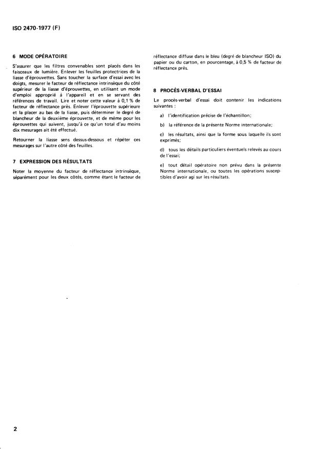 ISO 2470:1977 - Papier et carton -- Mesurage du facteur de réflectance diffuse dans le bleu (degré de blancheur ISO)
