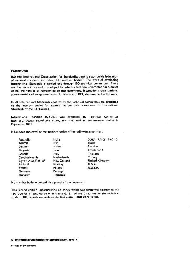 ISO 2470:1977 is a standard published by the International Organization for Standardization (ISO). Its full title is "Paper and board — Measurement of diffuse blue reflectance factor (ISO brightness)". This standard covers: Paper and board — Measurement of diffuse blue reflectance factor (ISO brightness)