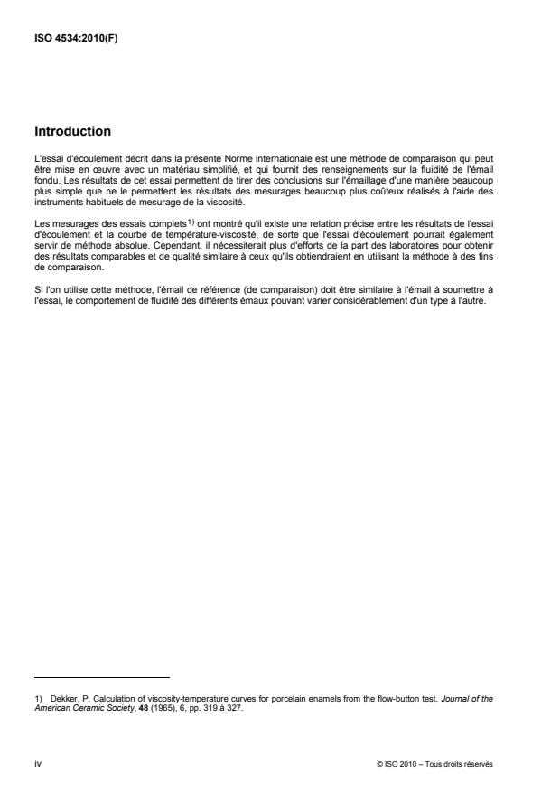 L'ISO 4534:2010 spécifie une méthode comparative de détermination du comportement de fluidité de l'émail vitrifié à l'état visqueux pendant la cuisson. Elle n'est pas destinée à servir de méthode absolue.