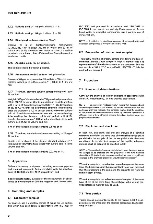 ISO 4691:1985 - Iron ores -- Determination of titanium content -- Diantipyrylmethane spectrophotometric method