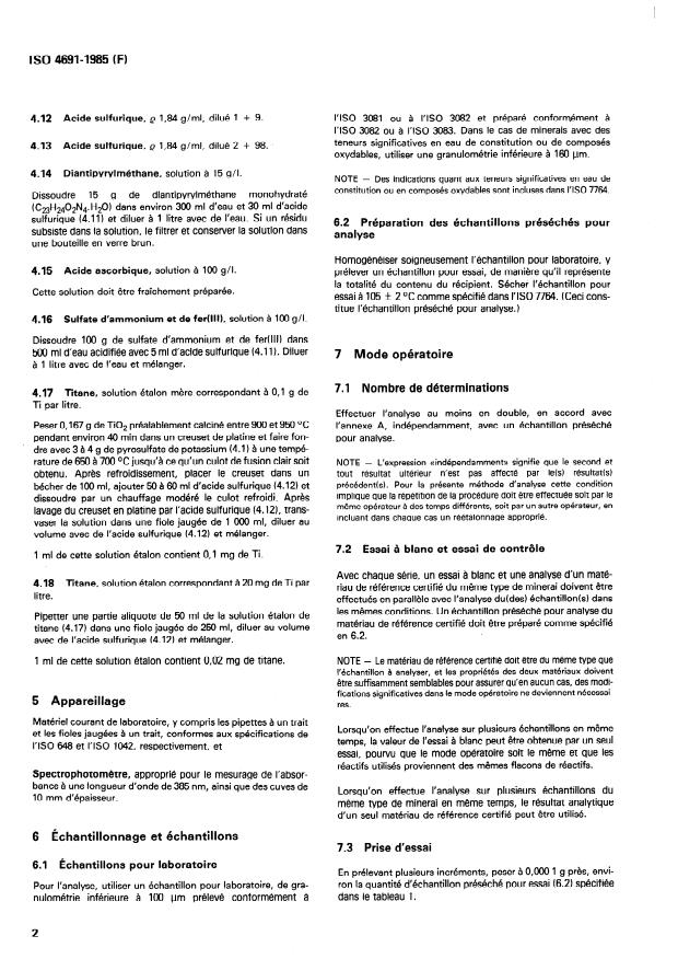 ISO 4691:1985 is a standard published by the International Organization for Standardization (ISO). Its full title is "Iron ores — Determination of titanium content — Diantipyrylmethane spectrophotometric method". This standard covers: The method ist applicable to a concentration range of 0,01 to 6,0 % (m/m) of titanium in natural iron ores, and iron ore concentrates and agglomerates including sinter products. Specifies principle, reagents, apparatus, sampling and samples, procedure, expression of results, and test report. ISO 4691 includes three annexes.