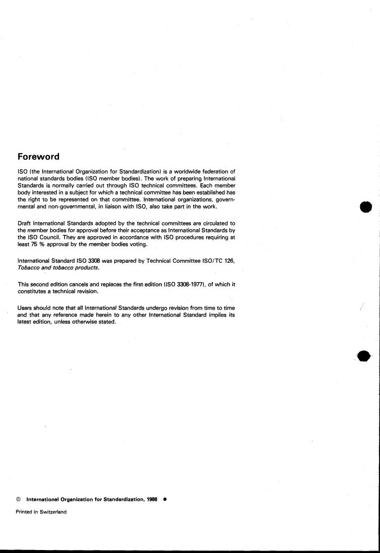ISO 3308:1986 is classified under the following ICS (International Classification for Standards) categories: 65.160 - Tobacco, tobacco products and related equipment. The ICS classification helps identify the subject area and facilitates finding related standards.