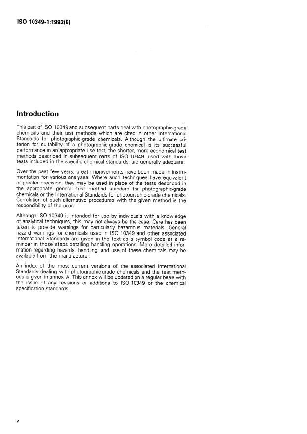 ISO 10349-1:1992 is a standard published by the International Organization for Standardization (ISO). Its full title is "Photography — Photographic-grade chemicals — Test methods — Part 1: General". This standard covers: Specifies criteria for reagents and materials, and addresses a number of general and common aspects involved in performing the tests given in subsequent parts of the standard. Annex A provides an index of International Standards on the specification of photographic-grade chemicals.