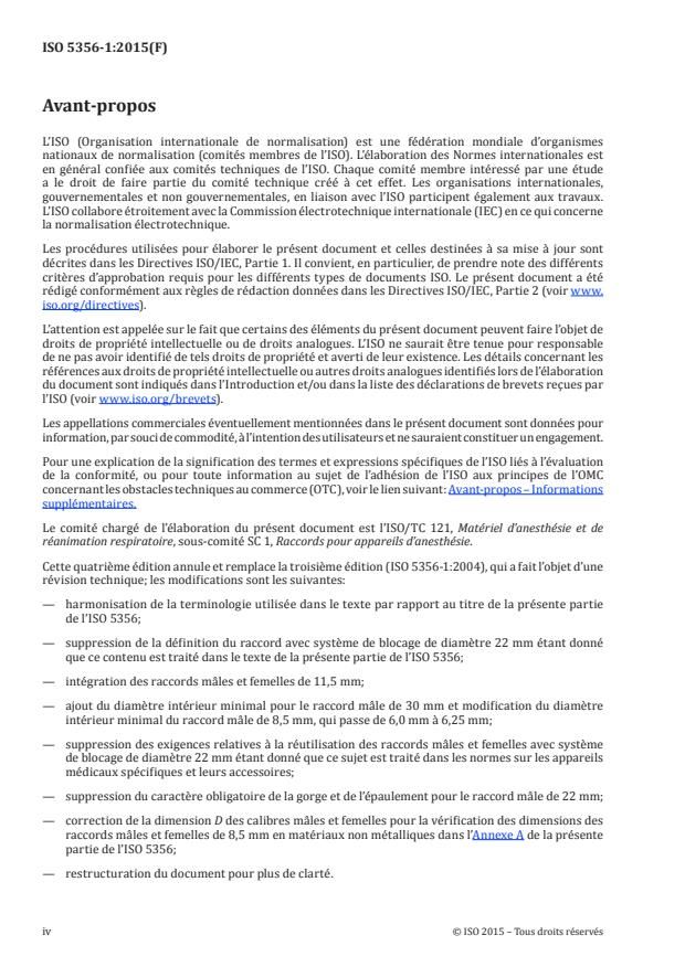 l'ISO 5356-1:2015 spécifie les exigences dimensionnelles et les calibres des raccords mâles et femelles destinés à être raccordés au matériel respiratoire et d'anesthésie, tels que les systèmes respiratoires, systèmes d'évacuation des gaz d'anesthésie et évaporateurs. Les prises mâles et femelles ne sont donc pas considérées comme des dispositifs en soi. Elle énonce les exigences relatives aux raccords mâles et femelles suivants: raccords de diamètres 8,5 mm et 11,5 mm pour les systèmes respiratoires en néonatalogie et en pédiatrie; raccords de diamètres 15 mm et 22 mm à usage général dans les systèmes respiratoires; raccords femelles avec système de blocage de diamètre 22 mm (avec exigences de performance); raccords de diamètre 23 mm destinés à l'emploi avec les évaporateurs mais non à l'emploi dans les systèmes respiratoires; raccords de diamètre 30 mm destinés au raccordement d'un système respiratoire à un système d'évacuation de gaz d'anesthésie. Elle ne spécifie pas les appareils médicaux et accessoires auxquels ces raccordements sont destinés. Les exigences relatives à l'application des raccords mâles et femelles ne sont pas incluses, mais elles font ou feront l'objet de Normes internationales particulières sur des appareils médicaux spécifiques et leurs accessoires. Les exigences relatives aux raccords à vis pouvant supporter un certain poids sont spécifiées dans l'ISO 5356-2.