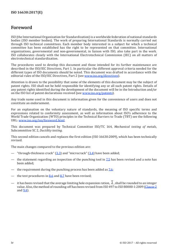 ISO 16630:2017 is a standard published by the International Organization for Standardization (ISO). Its full title is "Metallic materials — Sheet and strip — Hole expanding test". This standard covers: ISO 16630 describes a method of determining the hole expansion ratio in metallic sheets and strips with a thickness range of 1,2 mm to 6,0 mm inclusive and a width of at least 90 mm. NOTE This test is normally applicable to sheet metal and is used to assess the suitability of the product for forming flanges.