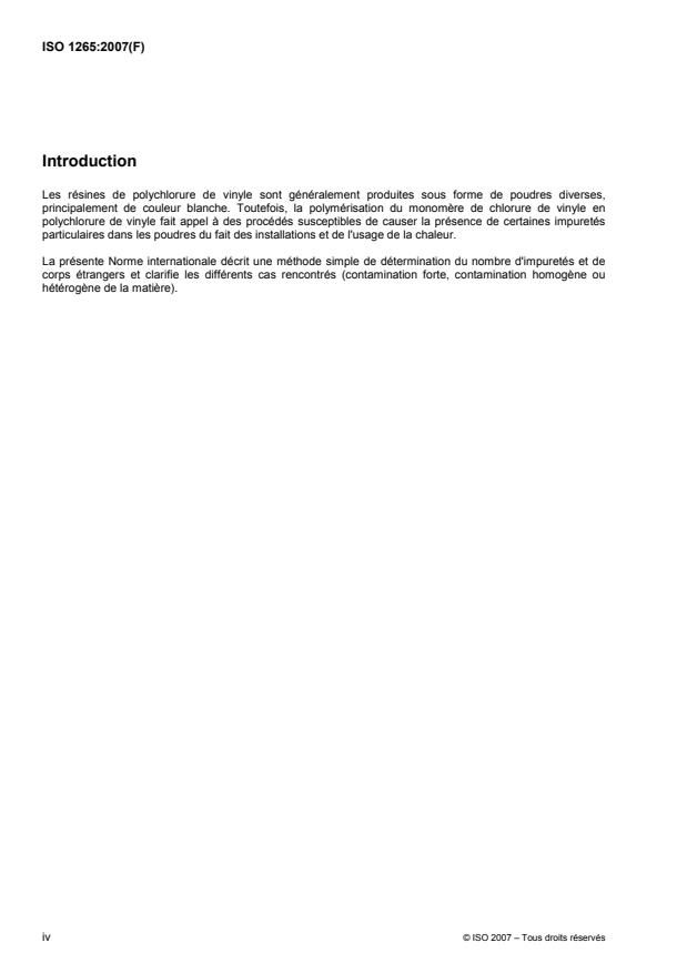 L'ISO 1265:2007 spécifie une méthode de détermination du nombre d'impuretés et de corps étrangers présents dans une surface écrasée de résine de polychlorure de vinyle. Elle n'est pas applicable aux résines pour pâtes, du fait de leur très grande finesse.