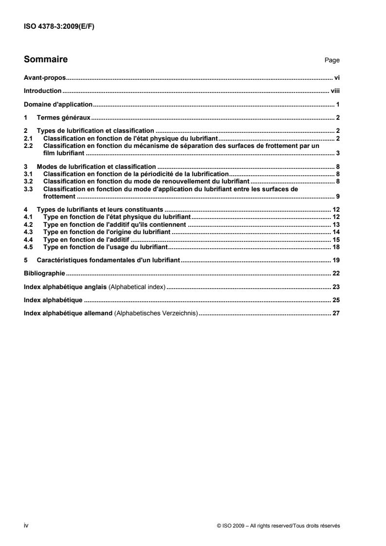 L'ISO 4378-3:2009 donne les termes les plus couramment utilisés en matière de lubrification, ainsi que leur définition et leur classification. Les formes abrégées données pour certains termes peuvent être employées dans les cas où elles ne créent aucune ambiguïté possible quant à leur interprétation. Les termes suffisamment explicites par eux-mêmes ne sont pas définis. En complément des termes utilisés anglais et français, deux des trois langues officielles de l'ISO (anglais, français et russe), l'ISO 4378-3:2009 donne les termes équivalents en allemand; ces termes sont publiés sous la responsabilité du comité membre allemand (DIN), et sont donnés uniquement pour information. Seuls les termes et définitions donnés dans les langues officielles peuvent être considérés comme étant des termes et définitions de l'ISO.