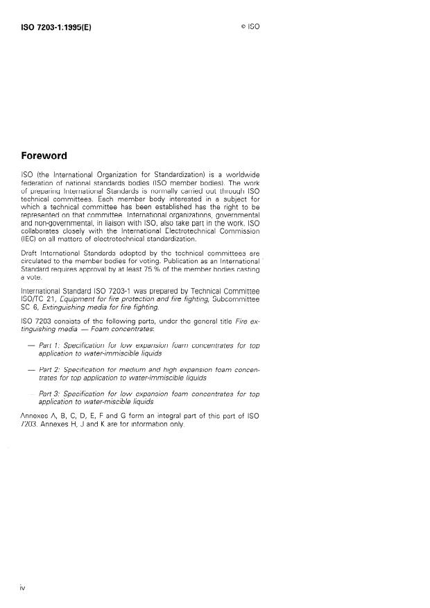 ISO 7203-1:1995 is a standard published by the International Organization for Standardization (ISO). Its full title is "Fire extinguishing media — Foam concentrates — Part 1: Specification for low expansion foam concentrates for top application to water-immiscible liquids". This standard covers: Contains the essential properties and requirements of liquid foam concentrates used to make low expansion foam for the control and extinction of fires of water-immiscible liquids.