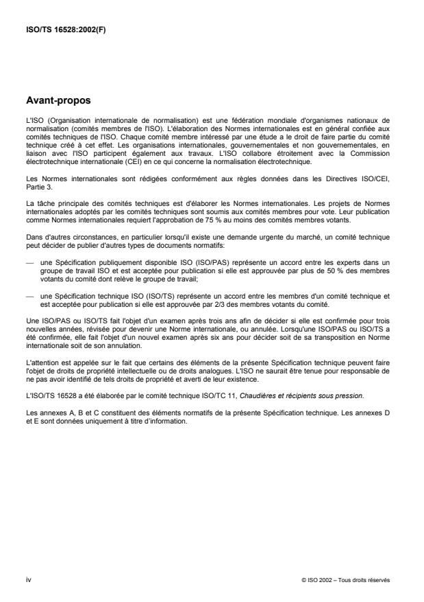 ISO/TS 16528:2002 spécifie les critères et la procédure d'enregistrement des codes et normes de chaudières et récipients sous pression, en vue de promouvoir leur reconnaissance internationale, de contribuer à la sécurité et de faciliter le commerce. ISO/TS 16528:2002 ne s'applique pas aux codes et normes des équipements nucléaires, des chaudières pour les chemins de fer ou la marine, des bouteilles à gaz, des tuyauteries ni des équipements mécaniques, tels que turbines, carters de machines.
