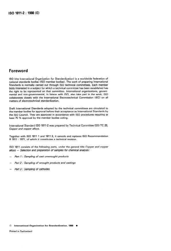ISO 1811-2:1988 is a standard published by the International Organization for Standardization (ISO). Its full title is "Copper and copper alloys - Selection and preparation of samples for chemical analysis - Part 2: Sampling of wrought products and castings". This standard covers: The methods are applicable to the given materials in the form of wrought products (plate, sheet, strip, rod, bar, tube, profile, forgings, etc.) and castings (sand castings, chill castings, die castings, continuous castings, centrifugal castings).The methods are intended to determine compliance with the requirements for chemical composition. Together with ISO 1811-1 and 1811-3 this part of ISO 1811 cancels and replaces ISO Recommendation R 1811:1971, of which it constitutes a technical revision.