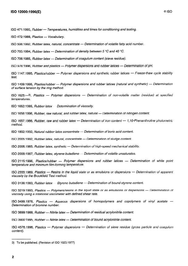 ISO 12000:1996 is a standard published by the International Organization for Standardization (ISO). Its full title is "Plastics/rubber — Polymer dispersions and rubber latices (natural and synthetic) — Definitions and review of test methods". This standard covers: Plastics/rubber — Polymer dispersions and rubber latices (natural and synthetic) — Definitions and review of test methods