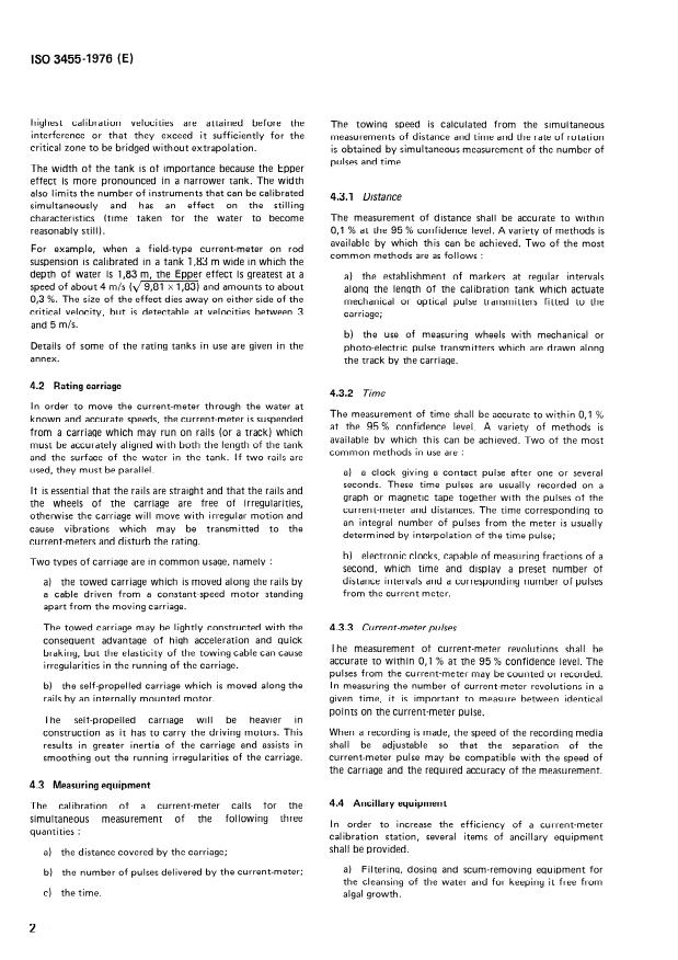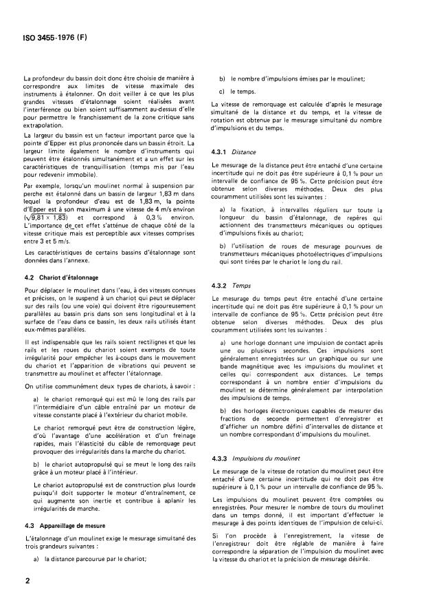ISO 3455:1976 is a standard published by the International Organization for Standardization (ISO). Its full title is "Liquid flow measurement in open channels — Calibration of rotating-element current-meters in straight open tanks". This standard covers: Specifies the procedure to be used for the calibration of current-meters, i.e. for the experimental determination of the relationship between liquid velocity and rate of revolution of the rotating element. Specifies also the type of tank and equipment to be used and the method of presenting the results.