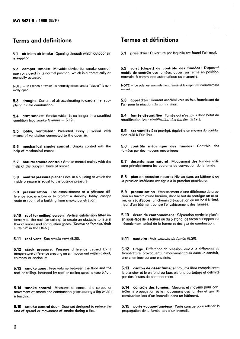 ISO 8421-5:1988 is a standard published by the International Organization for Standardization (ISO). Its full title is "Fire protection — Vocabulary — Part 5: Smoke control". This standard covers: Concepts are given in English in alphabetical order. A French index is provided. General use terms are covered by ISO 8421-1.