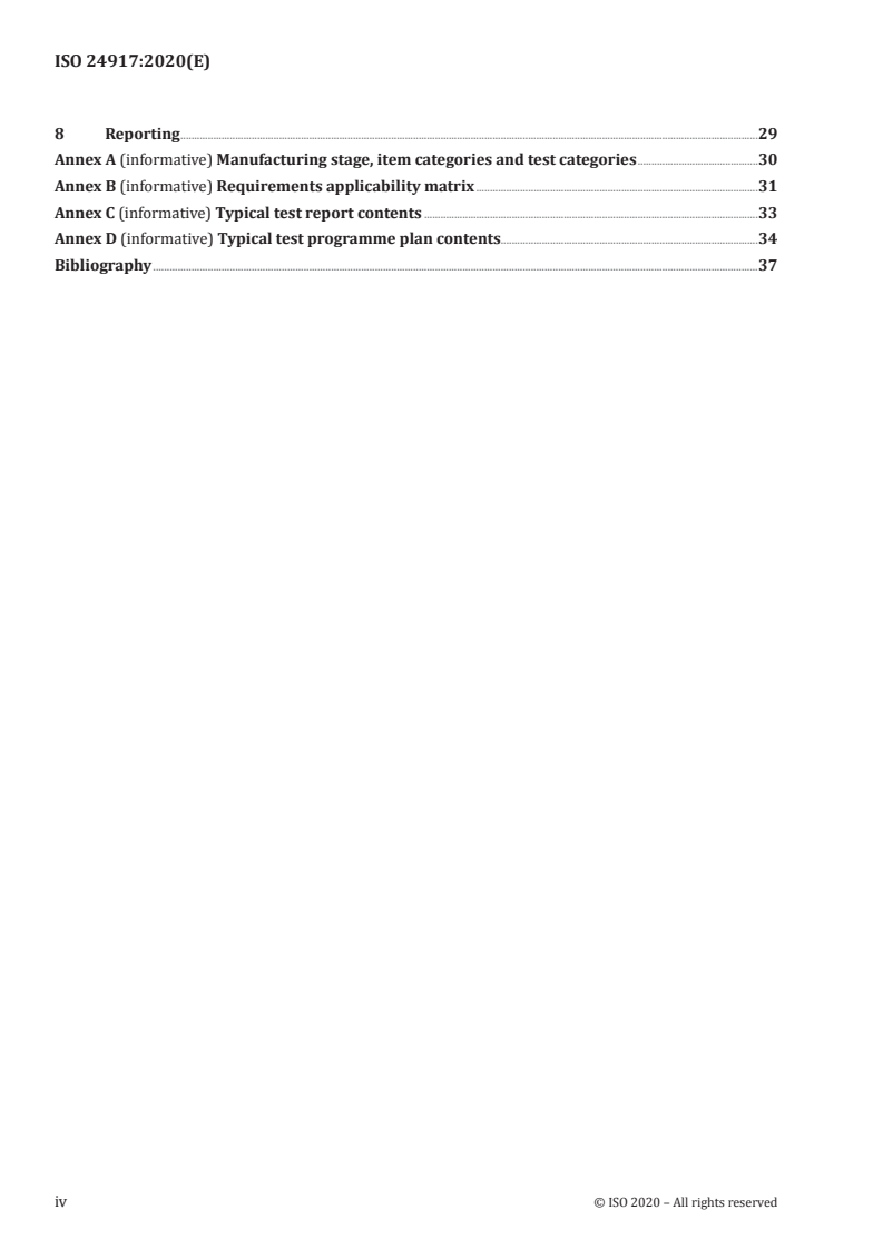 - Informative annexes: manufacturing/test category mapping, applicability matrix, typical test report and programme plan contents.