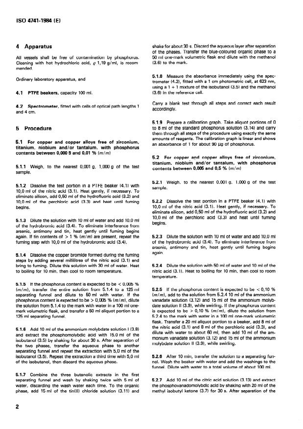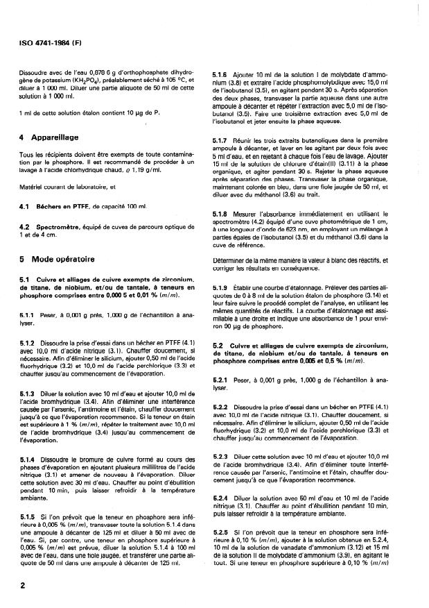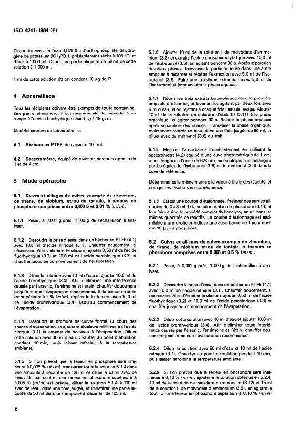 ISO 4741:1984 specifies a molybdovanadate spectrometric method for the determination of phosphorus in copper and copper alloys. The standard defines principle, reagents, apparatus, detailed procedure, calibration and expression of results, and test report requirements. The method is applicable to phosphorus contents in the range 0.0005 to 0.5 % (m/m) and covers dissolution, interference removal, extraction and spectrophotometric measurement.