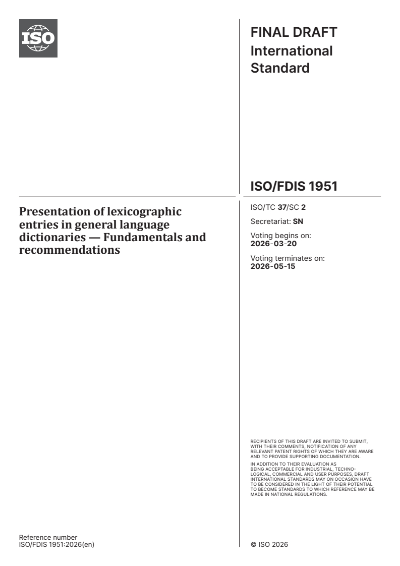 ISO/FDIS 1951: Presentation of Lexicographic Entries in General Language Dictionaries - Fundamentals and Recommendations is an international standard developed by ISO Technical Committee 37, Subcommittee 2. It establishes foundational principles and recommendations for structuring and presenting lexicographic entries in monolingual, bilingual, and multilingual general language dictionaries. The standard is designed for human end-users and applies to both print and digital formats. By providing guidance on the visual and structural aspects of dictionary entries, it promotes clarity, consistency, and user-friendly access to lexical information.