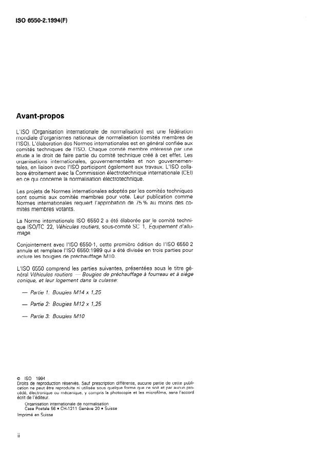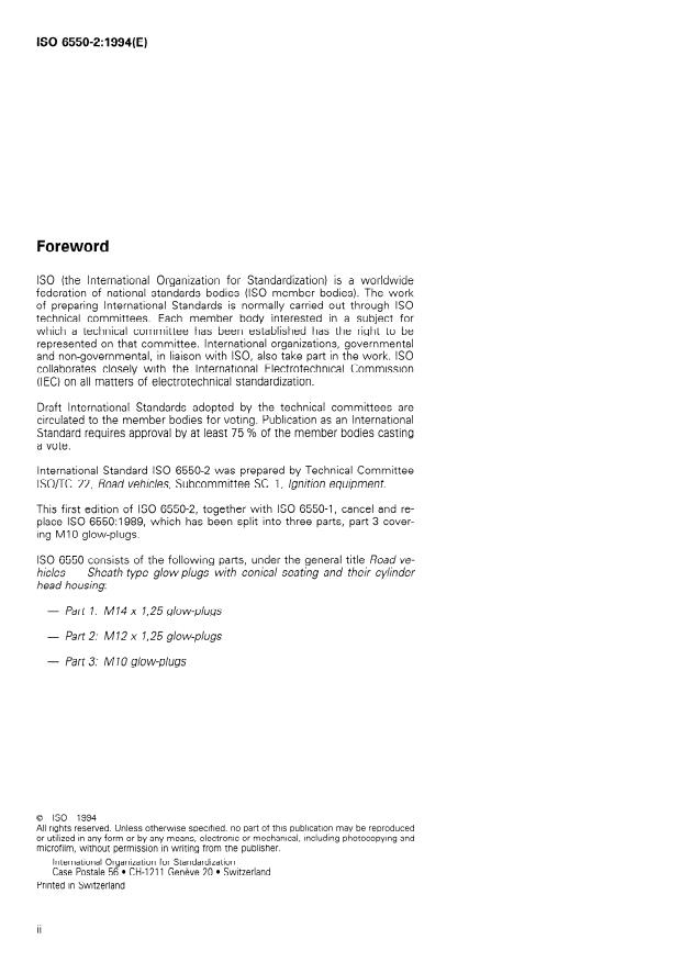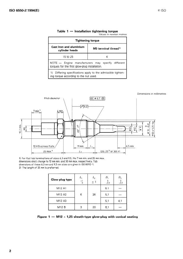 ISO 6550-2:1994 is a standard published by the International Organization for Standardization (ISO). Its full title is "Road vehicles — Sheath-type glow-plugs with conical seating and their cylinder head housing — Part 2: M12 x 1,25 glow-plugs". This standard covers: Specifies the main characteristics of M12 × 1,25 sheath-type glow-plugs with conical seating and their cylinder head housing, for use with diesel (compression-ignition) engines.